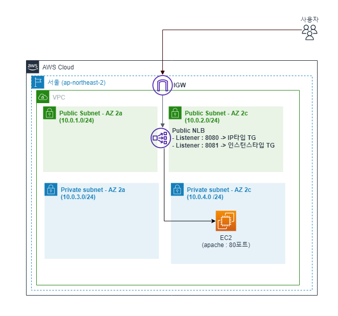 아래와 같이 간단하게 앞단에 NLB를 두고 뒷단에 EC2에 http 한개 올려서 테스트 해보자.