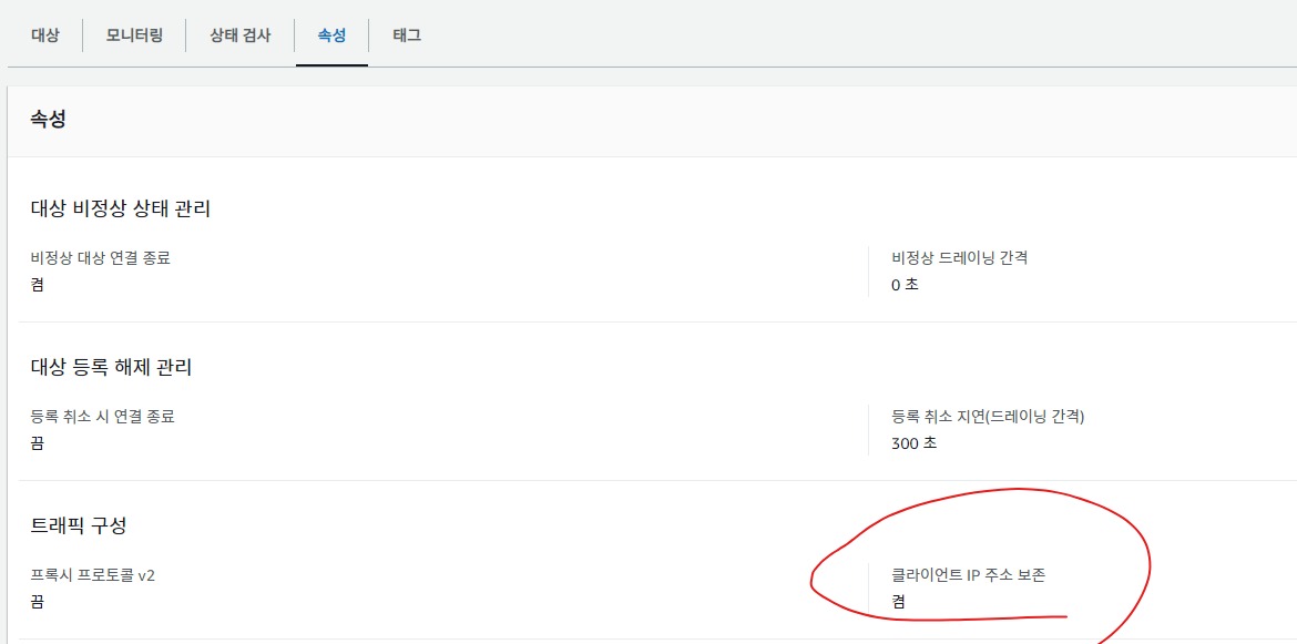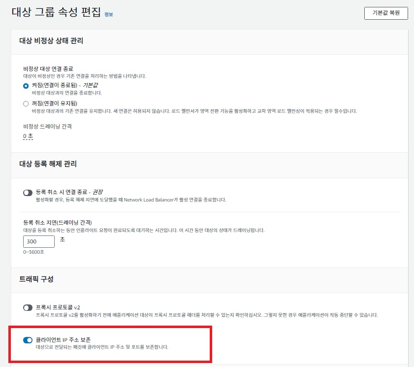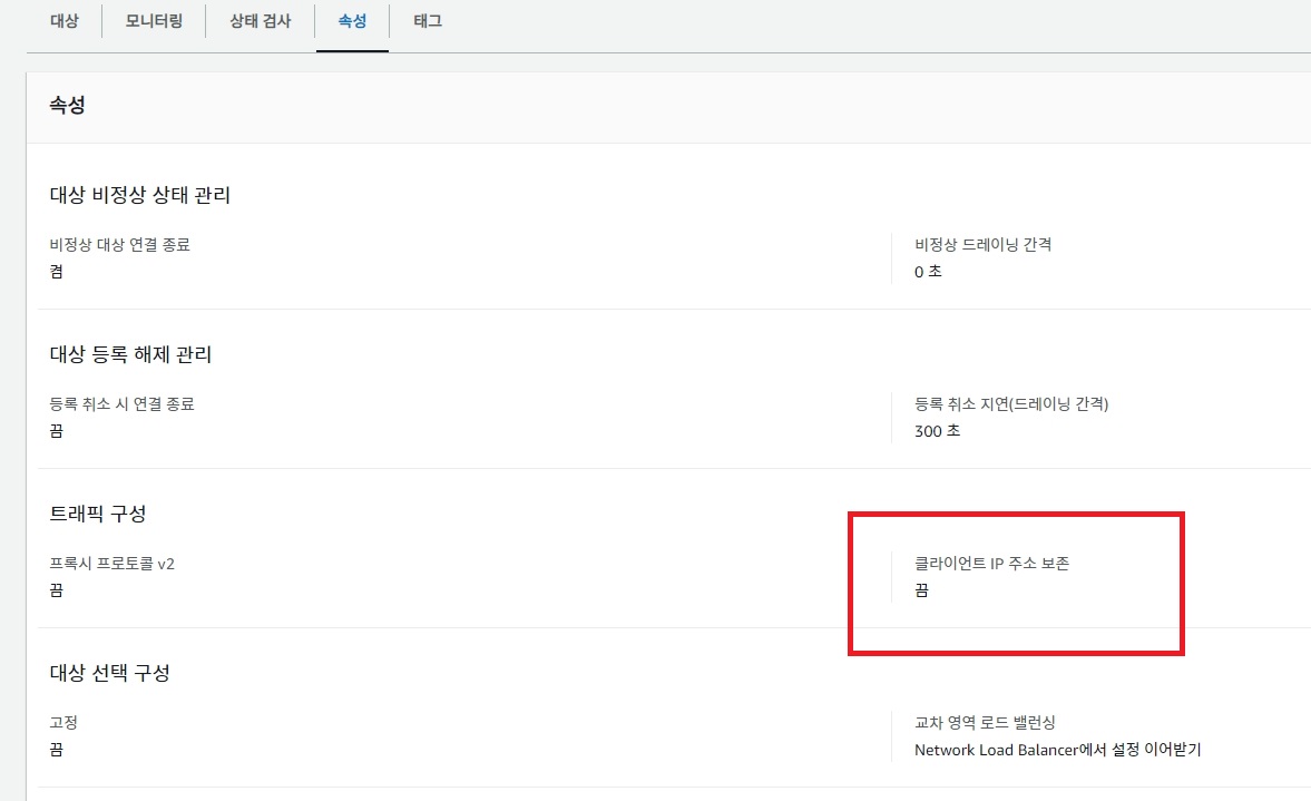 참고로 Target Group 유형이 ALB이거나 인스턴스 일 때는 클라이언트 IP주소 보존을 수정 할 수 없다.