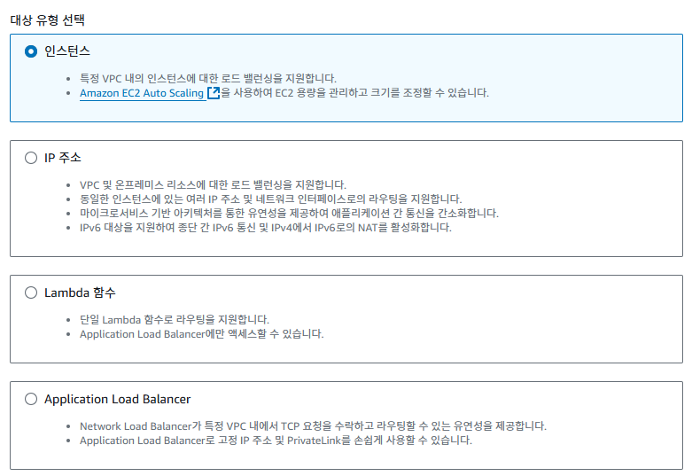 AWS에서 Public NLB를 구성하고 뒷단으로 트래픽을 라우팅 하려면 Target Group을 만들어야 한다. 타겟 그룹의 종류는 총 4가지이며 이때 NLB에 뒤에 연결 하는 리소스가 EC2일때는 2가지를 사용할 수 있다.