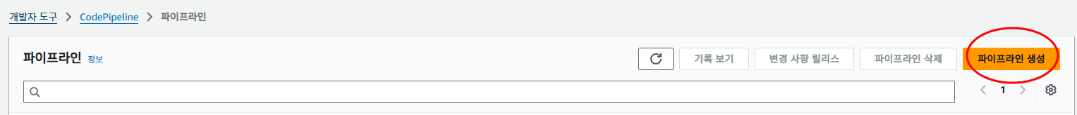 7. Code Pipeline 메뉴로 이동 해서 파이프 라인 생성 버튼을 누릅니다.