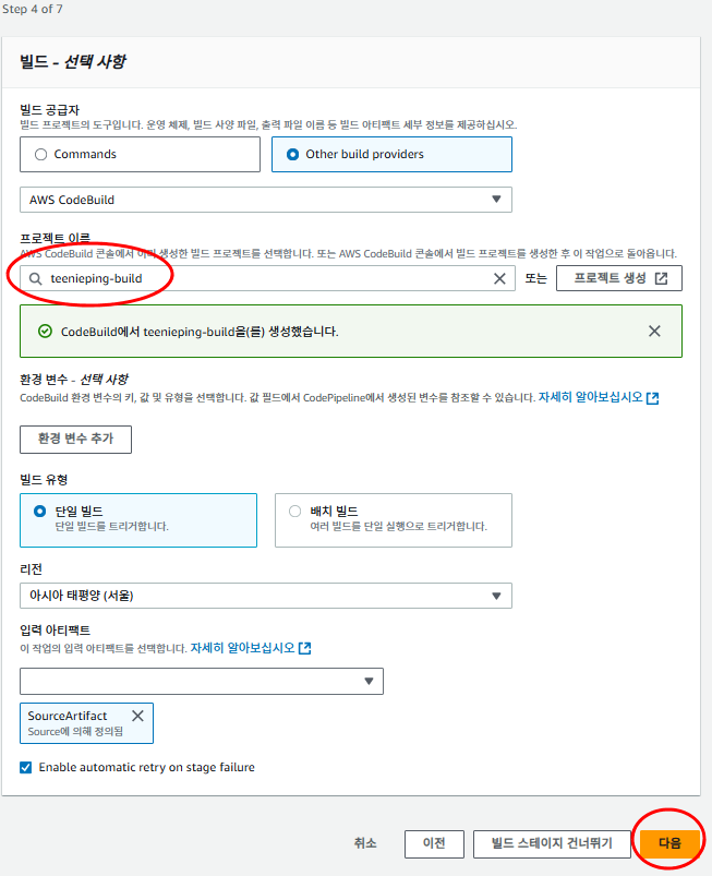 17. 빌드 스테이지 추가 부분에서 "other build provides" -> "AWS Code Build" 를 선택하고 "프로젝트 생성" 버튼을 누릅니다.