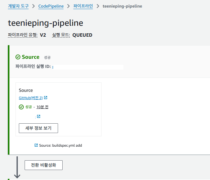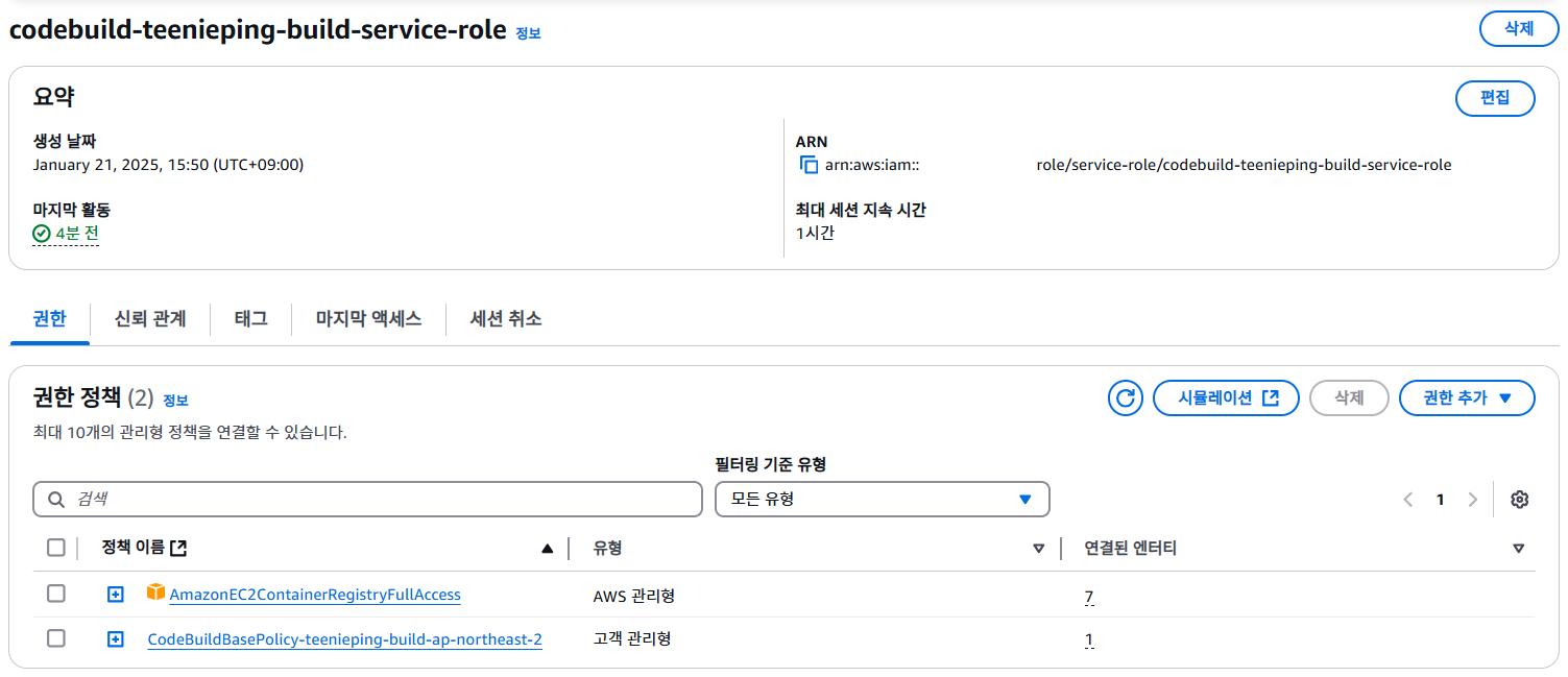 build 부분에서 권한 문제로 실패 해서 IAM 권한 추가 후 재수행시 Deploy 까지 성공 하였다.