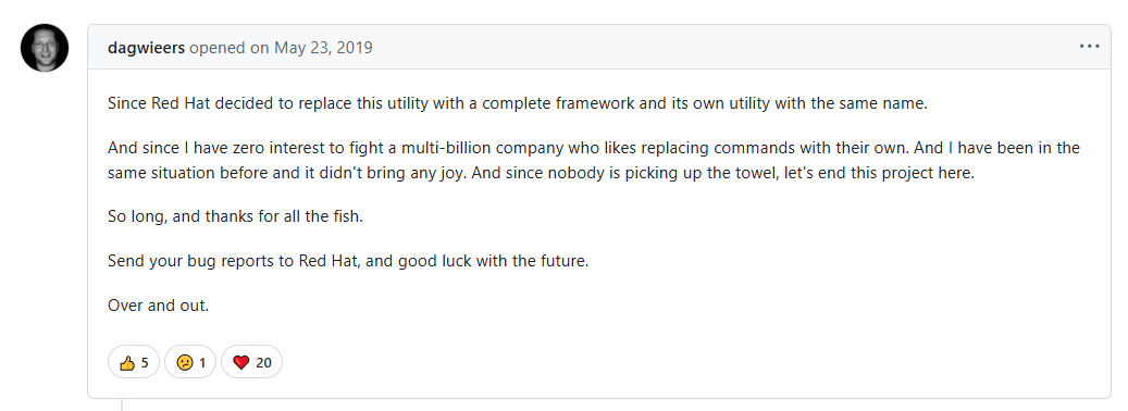 원인은 redhat이 해당이름으로 자체 유틸리티로 상용화 출시해버려서 변경 한 것 으로 보인다.
