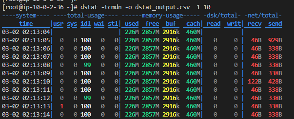 dstat -tcmdn -o dstat_output.csv
