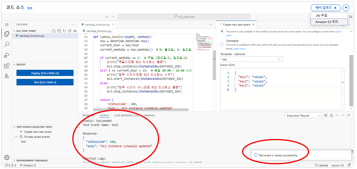 AWS Lambda에서 Python으로 코드를 작성하여 EC2 인스턴스를 주말에는 종료하고, 평일 오전 8시부터 오후 6시까지 실행되도록 설정합니다.