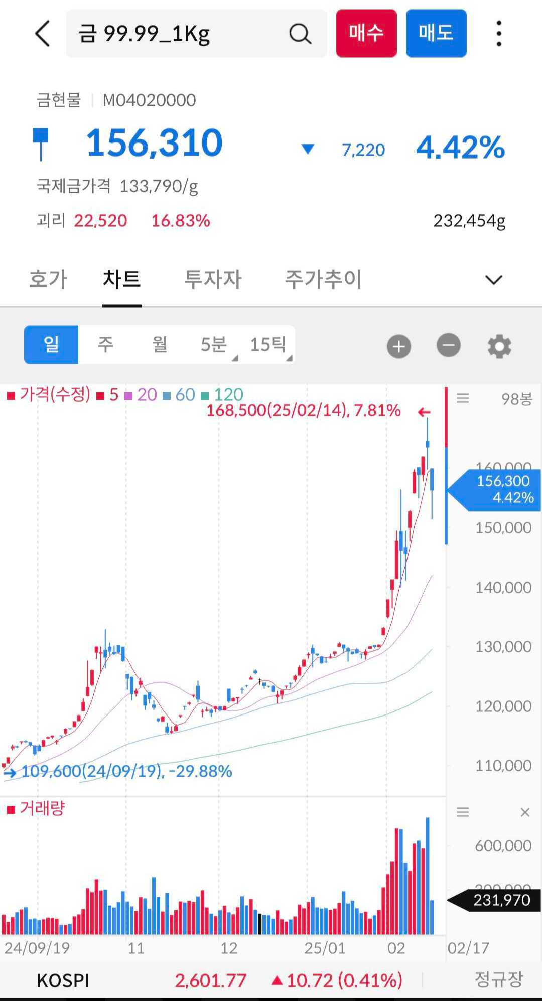 아래 보는 것 처럼 국제 금가격은 g당 133,790원 이며 현재 국내시장 KRX금현물은 1g당 156,310원 이다.